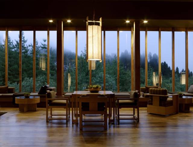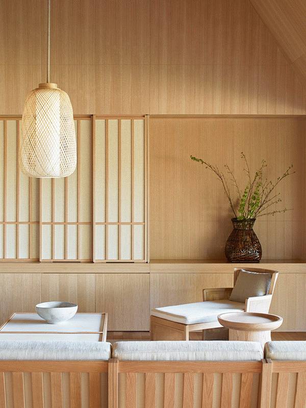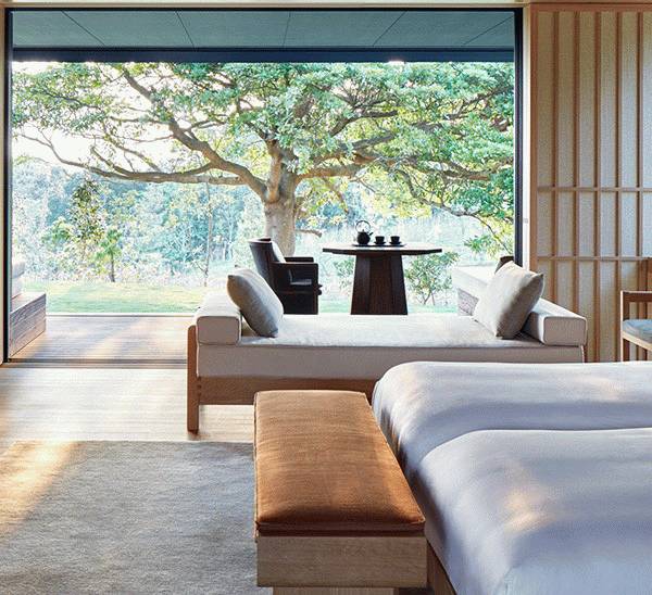 以当代设计风格重新演绎传统日式旅馆,空间设计呈现惊人的简洁之感,大落地窗将周边自然风光完美呈现,地板上铺就的榻榻米。房内空间开阔舒朗、采光充足,在设计中力求营造宁静、轻松、引人遐思的氛围。